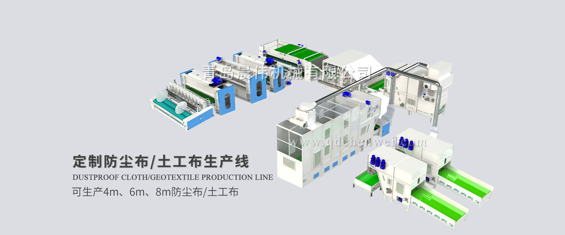 青島晨偉機械有限公司 專業設計定制各類無紡布單機設備及生產線。 我公司主要產品:電子秤重開包機、開松機、給棉機、氣壓棉箱、(高速)單錫林雙道夫梳理機、(高速)雙錫林雙道夫梳理機、鋪網機、中速針刺機、高速針刺機、烘箱/烘房、燙光機、熱軋機、收卷切片機,無紡布設備、仿絲棉設備、防塵布設備、噴膠棉設備、無膠棉設備、硬質棉設備、土工布設備生產線、椰棕床墊生產線、大棚保溫被生產線、蠶絲被生產線、床上用品設備等各種無紡布機械設備。